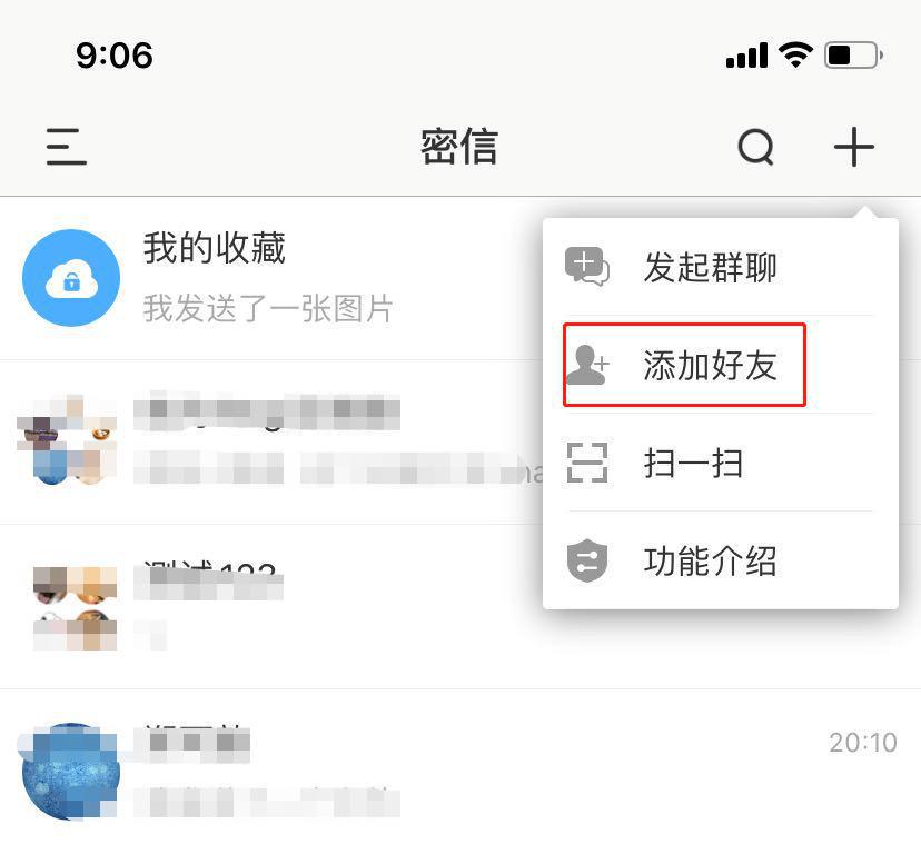 点击主界面右上角的'+',选择【添加好友】(或点击右上角搜索图标),在上方搜索框中,输入想要添加的用户的手机号/密聊号,点击【搜索】-【聊天】-【发送申请】,即可发送验证消息; 点击主界面右上角的'+',选择【扫一扫】,扫描对方的二维码,点击【聊天】-【发送申请】,即可发送验证消息。