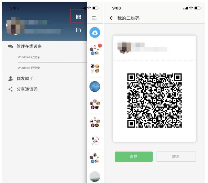 - 手机端:点击主界面左上角【三横杠】,点击名片右上角的二维码图标,可选择【保存】或者【转发】至密聊联系人/群组。