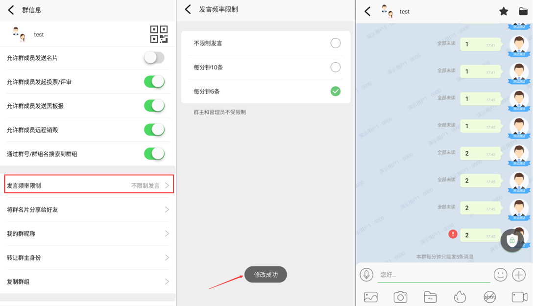设置发言频率后,若群成员发言次数超过限制,则当前时间段内无法继续发送消息。过了这段时间,该成员即可继续发送消息或重发被限制未发出的消息。