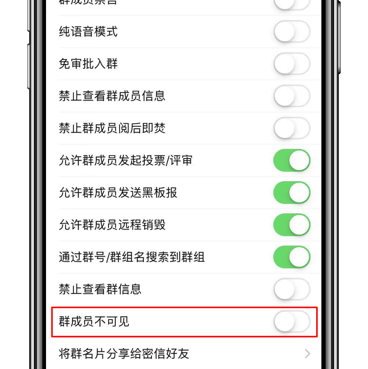 - 进入群信息页面,打开群成员不可见,设置后群成员将无法看到群人数也无法在群信息页面中看到其他成员的头像。