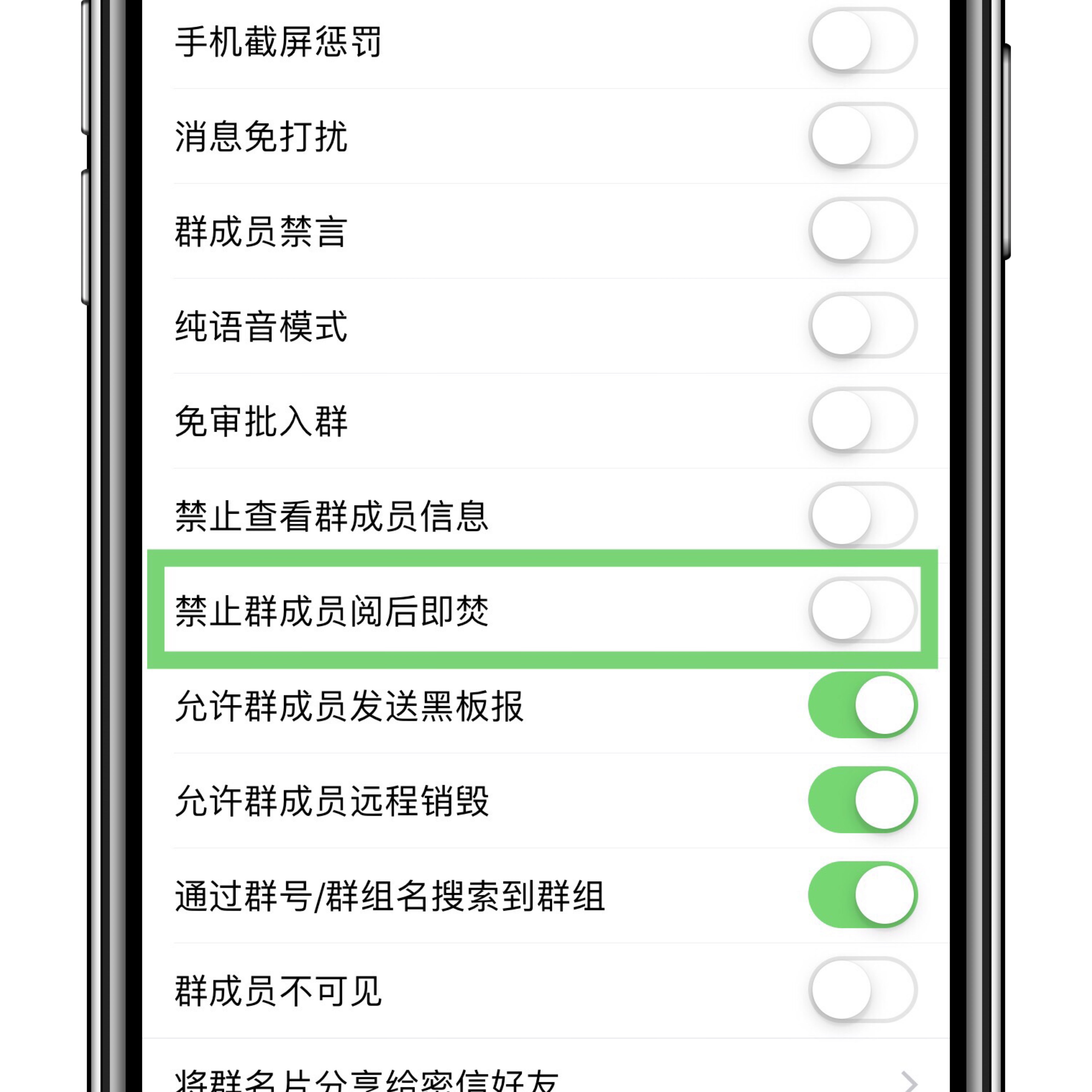 - 群主或者群管理员,进入群信息页面,打开【禁止群成员阅后即焚】即可。