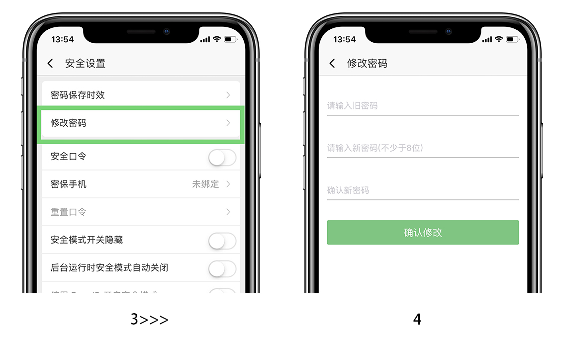 手机端:点击主界面左上角【三横杠】,依次点击【设置】-【安全设置】-【修改密码】,输入旧密码和新密码并确认新密码,点击【确认修改】即可。
