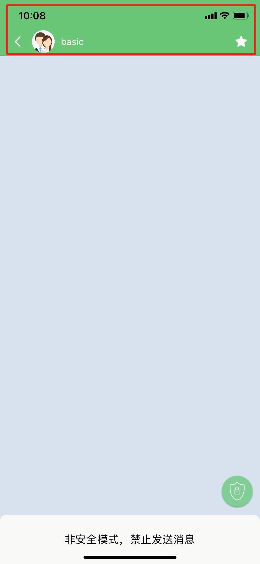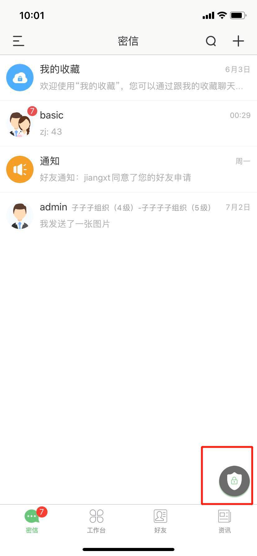 - 密聊初始登录后默认开启安全模式,并且只有在安全模式下才能进行即时通讯,通过点击右下角的盾牌图标或长按主界面顶部可进行安全模式与非安全模式的切换。非安全模式下,所有的聊天数据,包括我的收藏和通知消息等都会被隐藏。