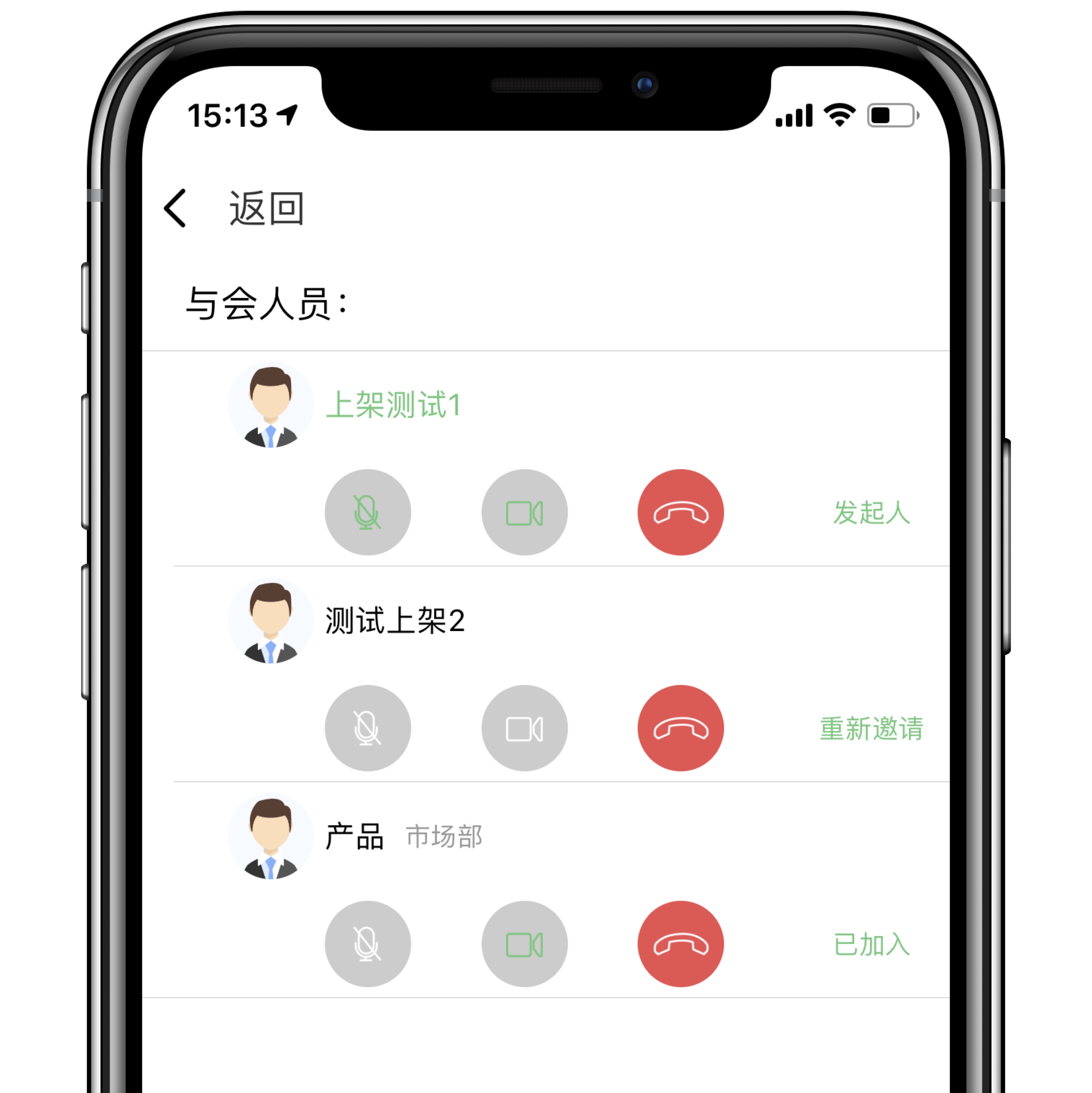 - 视频通话设置界面,发起者可以对参与者进行操作。点击【静音】按钮,即可静音参与者;轻点红色【挂断】按钮,可将参与者请出本次通话;轻点【摄像头】按钮,即可将参与者的图像关闭;